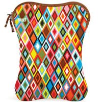 This BUILT laptop sleeve will accommodate most 12 to 13-inch notebooks. It's composed of extra-thick durable neoprene, which will provide maximum protection for your notebook. With its unique bone shape, it conforms to the size of your computer and creates an instant, built-in bumper system for extra protection. Its exclusive Shark Gill Grips, on the sides, makes gripping and handling slip-free. Safely slide your notebook in and out of your briefcase or luggage with ease. Sleeve lays flat when not in use. Perfect for business travelers and urban nomads alike. French Bull Mosaic design. Machine washable.