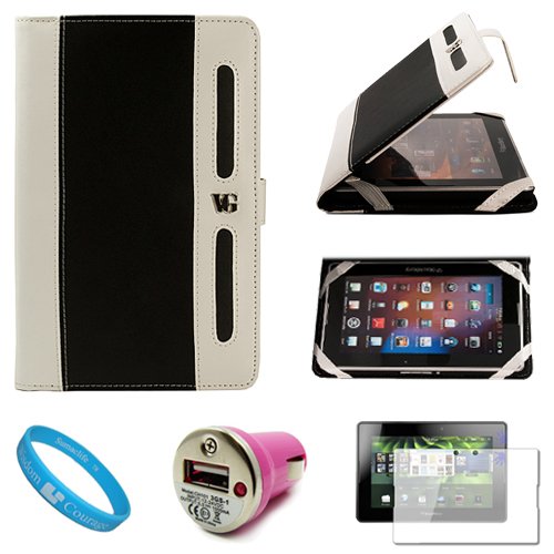 !±8± Black with White Executive Leather Jacket Carrying Case Cover with Accessory Slots for Blackberry Playbook 7-inch Tablet Compatible with all Models (16GB, 32GB, 64GB) + Clear Screen Protector + Pink USB Car Charger with LED Power Indicator + SumacLife TM Wisdom Courage Wristband